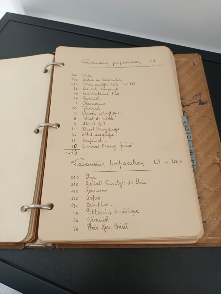 L’inauguration a aussi été l’occasion d’un clin d’œil à l’histoire : dans les vitrines du nouveau bâtiment, des carnets de formules manuscrites datant d’avant-guerre témoignent de l’héritage olfactif grassois.