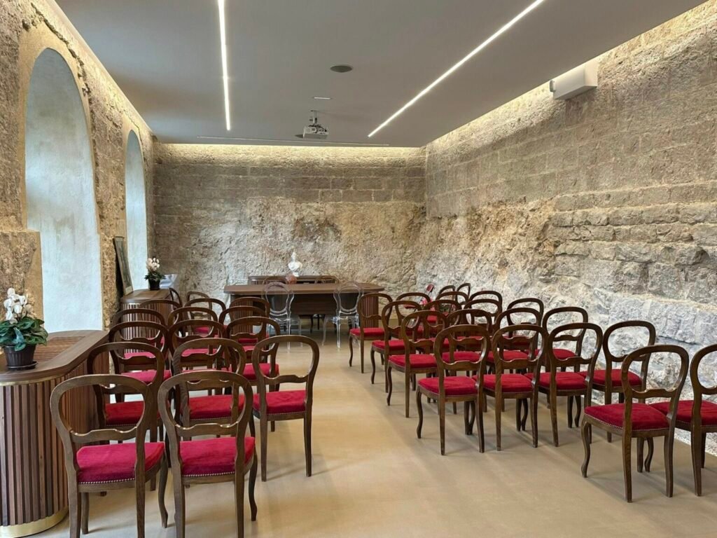 Avec ses pierres anciennes, son mobilier en bois noble et ses sièges aux tons rouges et or, la salle marie subtilement l’histoire et la contemporanéité.