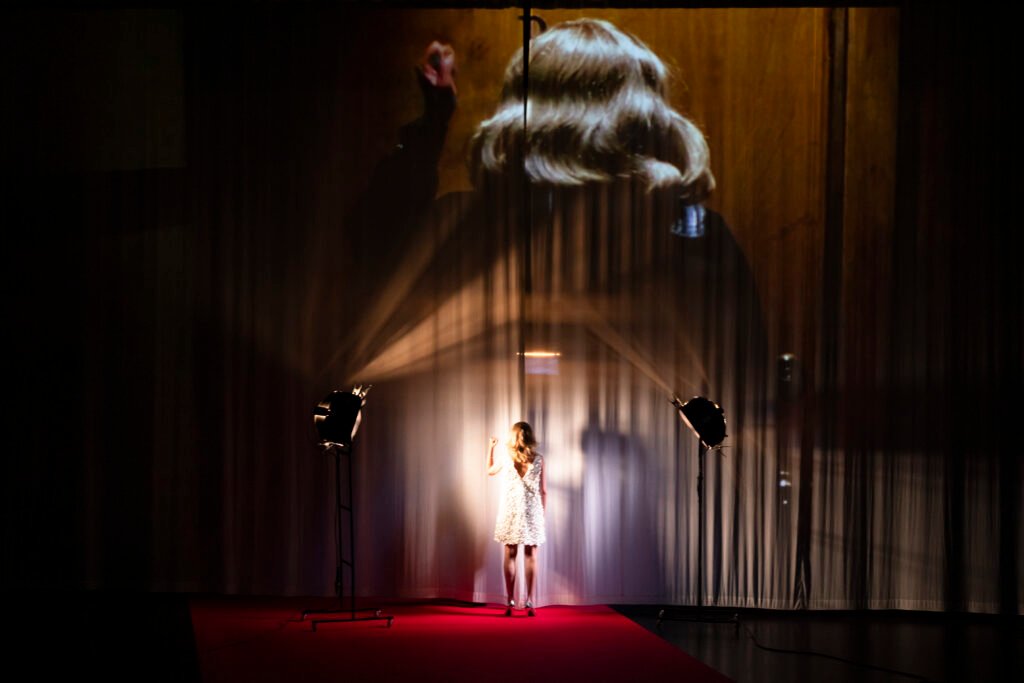 Dans cette adaptation singulière, DE HOE renverse les codes : plutôt que de représenter le théâtre comme dans le film, la troupe invite le cinéma à envahir la scène. Les acteurs évoluent entre caméras, projections, lumières mouvantes et décors éclatés ; le spectateur, lui, plonge au cœur d’un dispositif vivant et vibrant.