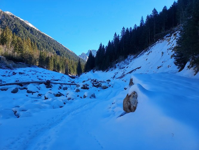 - Du sanctuaire de Fenestre (1 903 m – b.357), s’élever (nord-est) sur la trace (b.357) du chemin militaire qui monte en lacets sur les flancs de l’Agnellière pour traverser bientôt le torrent (couvert par la neige) issu du col de Fenestre et du Pas des Ladres (b.368).