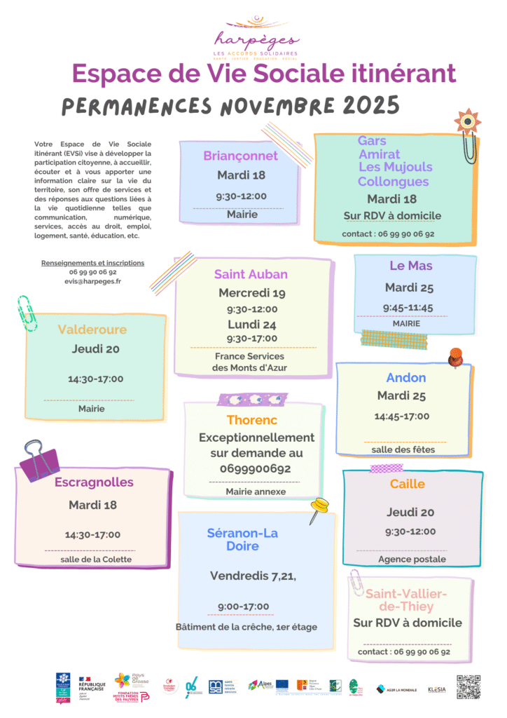 Planning des permanences de médiations sociales de l’EVSi Harpèges pour le mois de novembre 2025.